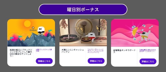 曜日別ボーナスの内容は登録したメールアドレスに届くので、そちらで詳細をご確認ください。