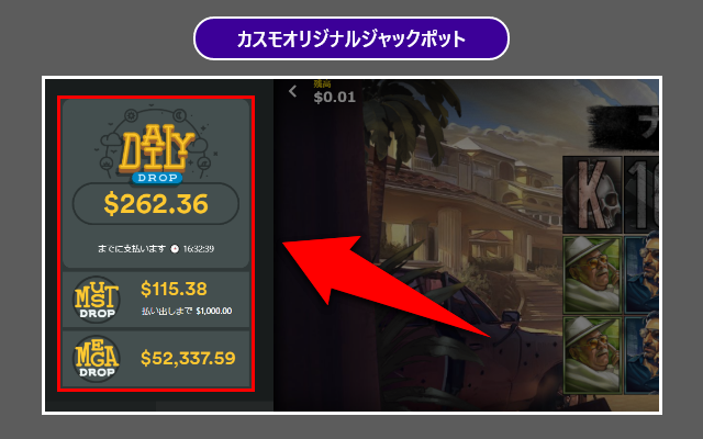 カスモのRed Tiger社のスロット約100機種には、カスモオリジナルジャックポット機能「マストドロップジャックポット」が付いています。