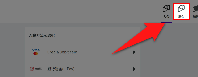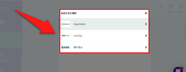 出金ページには使用可能な決済方法一覧が表示されるので、使用したい決済方法を選択しましょう。