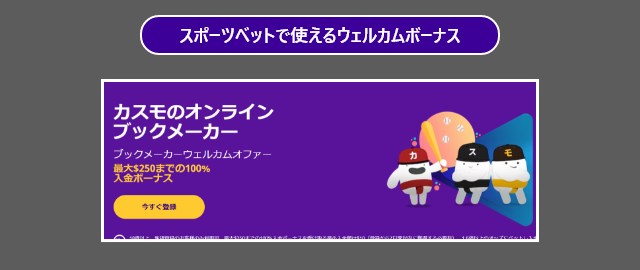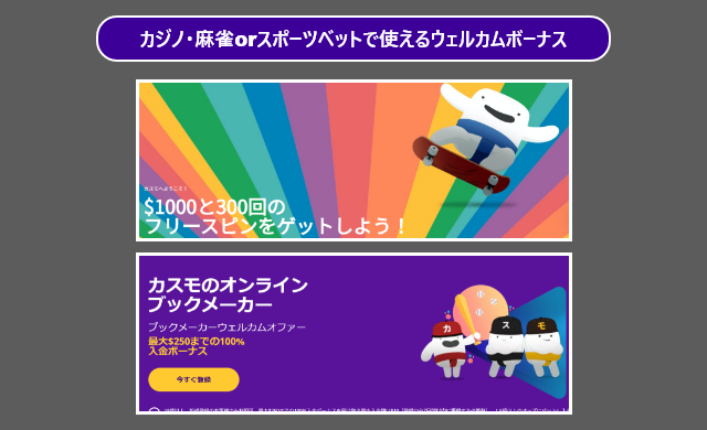 カスモには「カジノゲーム&麻雀で使える最高$1,050+300回フリースピン」と「スポーツベットで使える最高$250」の2つのウェルカムボーナスがあります。