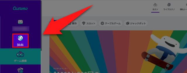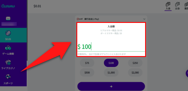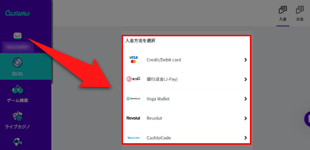 カスモで遊ぶためにはリアルマネーを入金する必要があります。入金手順は下記のとおりです。画像つきで解説していきます。