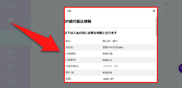 銀行送金の場合は、振込先の銀行口座情報が表示されます。