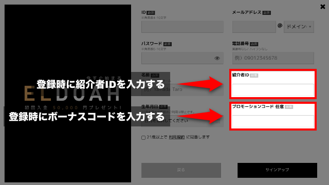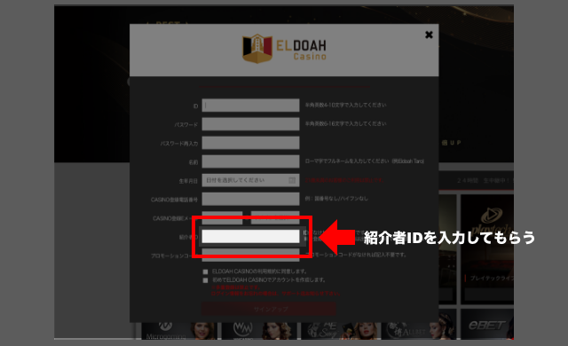 エルドアカジノを紹介したい友達に、登録時手続きに紹介者ID欄に紹介者ご自身のアカウントIDを入力するようにお伝えください。