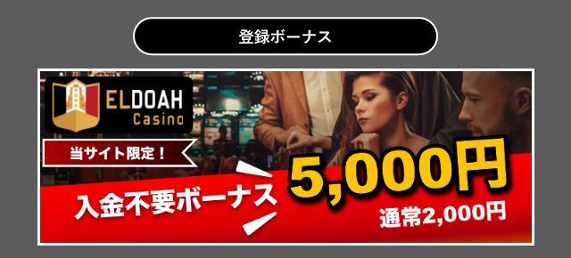 当サイトからエルドアカジノへ登録するだけで5,000円の入金不要ボーナス(登録ボーナス)を贈呈しています。入金不要ボーナスの出金条件は1倍、ボーナスも勝利金もすぐに現金化可能です。