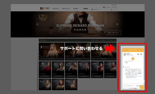 エルドアカジノの初回入金ボーナスがほしい場合は、初回入金後、残高が100円未満になったらサポートに合言葉【2021FCB】をお伝えください。