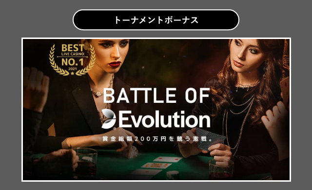 例えば、2021年3月には、ライブカジノEvolutionGamingで100円ベットすると獲得できるポイント数で競うトーナメントが開催されました。1位の賞金は50,000円の出金条件1倍ボーナスです。