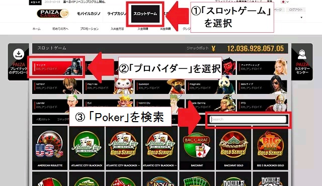 公式サイト画面上部の『スロットゲーム』メニューをクリックして、中央部に出る各ソフトウェア名から「Poker」または「Hold’em」と検索すると、テーブルゲームのポーカーとビデオポーカーが表示されます。