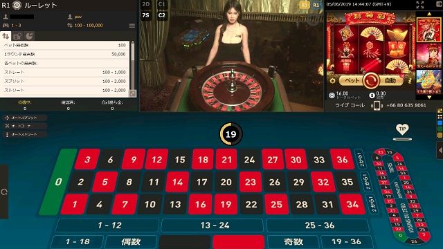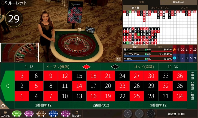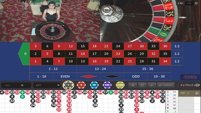 ロータスライブのルーレットの特徴は赤黒の結果を表示している罫線です。通常ルーレットで使用する罫線では単に赤黒の色だけを使用しますが、ロータスルーレットでは色と一緒に出目の番号もわかるような表記になっています。アウトサイドベットとストレートベットを組み合わせて賭ける時の参考になるので、地味に使い勝手のいいテーブルです。
