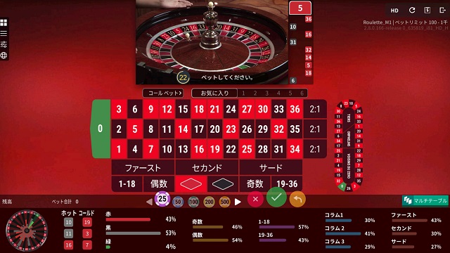 リアルなホイールの外側に表示されているバーチャルホイールでベットする数字を決められるので、エリア分割して賭け先を予想するシフトベット法を活用するのにちょうどいいテーブルです。