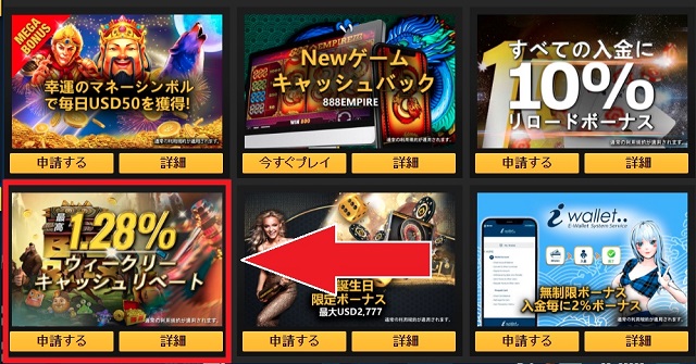 なかでもおすすめは業界トップクラスの還元率・還元額を誇るリベートボーナス!スロット・ライブカジノ・テーブルゲームどれで遊んでも獲得できますが、申請を忘れると貰えないので気を付けてくださいね。
