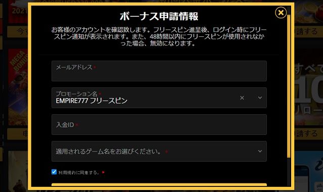 EMPIRE777フリースピン申請で入力するのは以下4項目です。