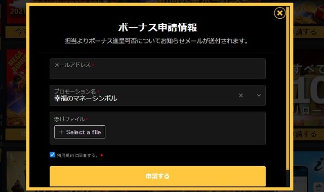 初回入金から24時間以内にプロモーションページにある初回入金ボーナスの「申請」をクリックしてください。