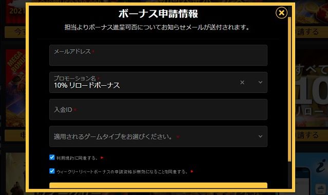 初回入金ボーナス申請時に入力する項目は以下4点です。