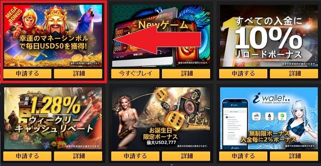 撮影したスクリーンショットを提出したい場合、プロモーションページにある「幸運のマネーシンボルで毎日USD50を獲得!」の「申請する」をクリックしてください。