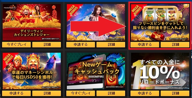 EMPIRE777フリースピンの申請は、プロモーションページにある「フリースピンをゲットして限りない勝利金をを手に入れよう!」の「申請する」をクリックしてください。