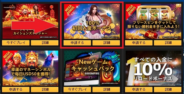 エンパイアカジノに新規登録したプレイヤーは、一回目の入金時に100%初回入金ボーナスを獲得できます。