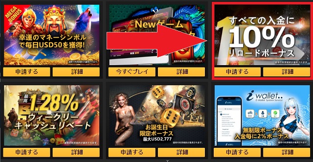 | 10%リロードボーナス | $50 | スロット:30倍 ライブ・テーブル:9倍 | 1ヵ月間 |