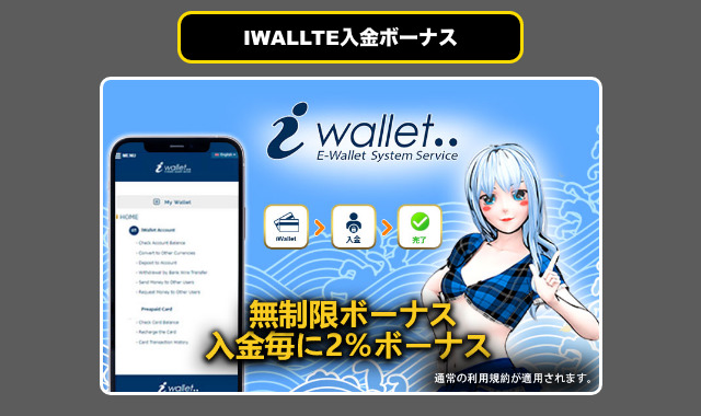 | 無制限IWALLET入金2%ボーナス | 入金額の2% | 1倍 | 1ヵ月間 |