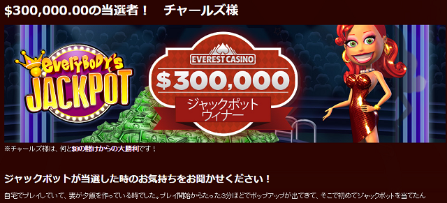 中でもエベレストカジノはジャックポット付きのゲームに力を入れており、実際にジャックポットを当てたプレイヤーのインタビューも掲載しています。