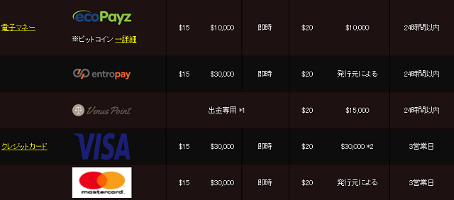 | 決済サービス名 | 最低入金額/最高入金額 | 最低出金額/最高出金額 |