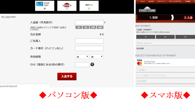 この項目では、エベレストカジノの入出金方法についてご紹介します。