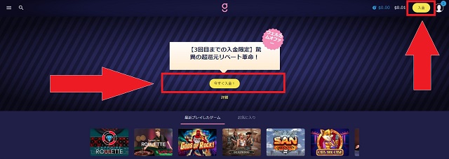 ログインページの上部「入金」か、ページ中央部にある「今すぐ入金」をクリックして入金画面を開きます。