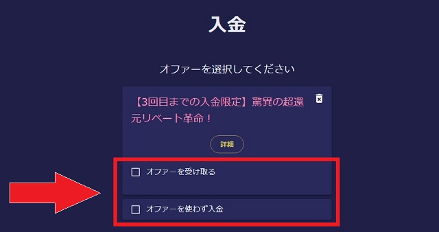 ギャンボラではウェルカムオファー等入金関係のオファーがある場合は、入金画面で「オファーを受け取る」「オファーを使わず入金」の2つの選択肢が表示されるので、どちらかにチェックを入れてください。