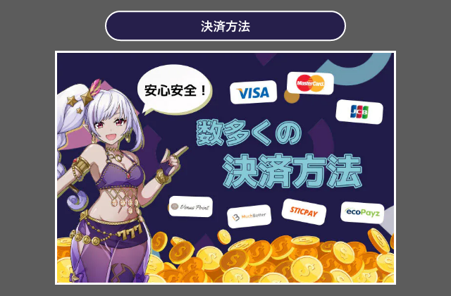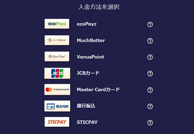| 入金方法 | クレジットカード(MasterCard / JCB ) / ecoPayz / VenusPoint / MuchBetter / STICPAY / 銀行送金 |