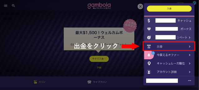 ギャンボラから出金したい場合は、メニュー「出金」をクリックしましょう。