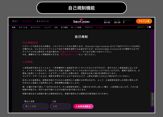 以下、インターカジノの自己規制機能で制限できる項目です。ログイン後、「マイカジノ」⇒「自己規制」ページから設定できます。