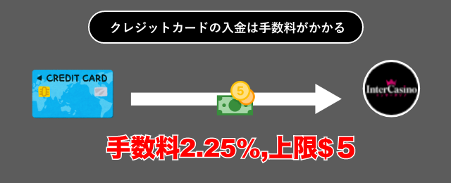 インターカジノは、クレジットカードでの入金、銀行送金による出金に手数料がかかります。