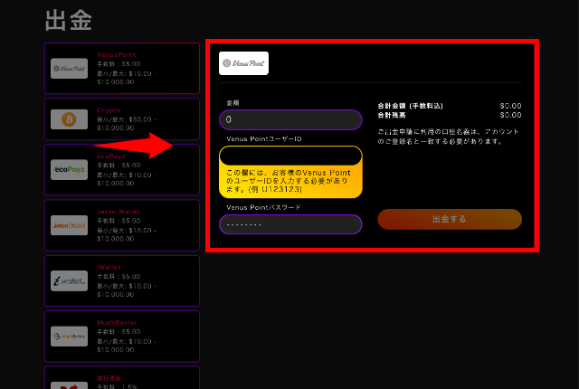 ログインページにて、「マイカジノ」⇒「出金」の順にクリックすると、出金ページが表示されます。