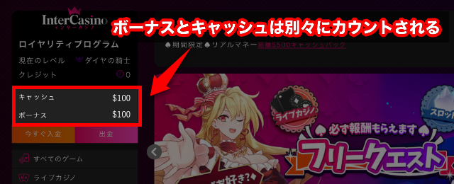 インターカジノの新規登録者向けウェルカムボーナスは、出金条件がないので、プレイヤーから好評です。