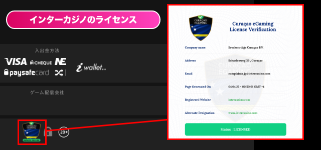 インターカジノの運営は、オランダ領キュラソーに登記しているBreckenridge Curacao B.V.が担っています。同社はベラジョンカジノも運営しており、信頼度の高さは言わずもがなです。
