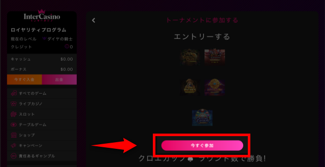 トーナメントに参加するには、メニューの「トーナメント」をクリックしてください。トーナメントの詳細ページが表示されたら「今すぐ参加」をクリックしましょう。