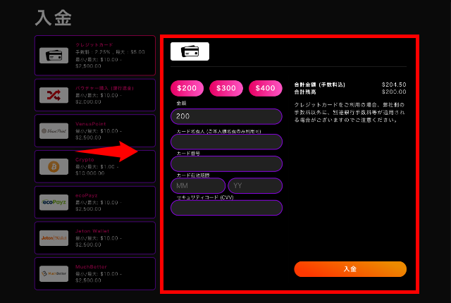 | 入金方法 | クレジットカード(VISA / MasterCard / JCB / American Express) / 仮想通貨 / MuchBetter / ecoPayz / Vegawallet / Jeton / 銀行送金 |