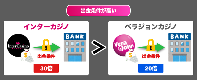 同系列のベラジョンカジノはボーナスの出金条件20倍、他オンラインカジノの中には出金条件がないところもあるので、インターカジノの出金条件は厳しい部類に入ります。