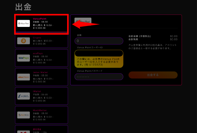 ページ左側に使用可能な決済方法が表示されるので、出金で使用したい決済方法をクリックして選択してください。