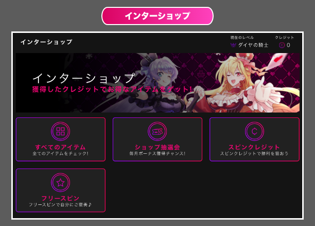 貯まったクレジットはインターショップでアイテム・ボーナス購入に使用でき、レベルアップすると購入できるアイテム・ボーナスも豪華になります。