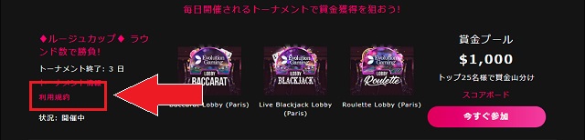 トーナメントの注意事項は各トーナメントの利用規約をご確認ください。利用規約は「トーナメント情報」下の「利用規約」をクリックすれば表示されます。
