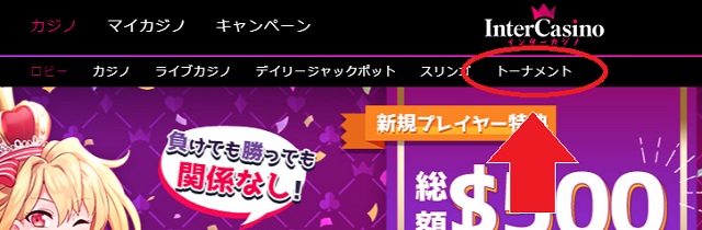 インターカジノは定期的にスロットまたはライブカジノ対象のトーナメントを開催しており、トーナメントで入賞すると出金条件1倍のボーナスがもらえます。