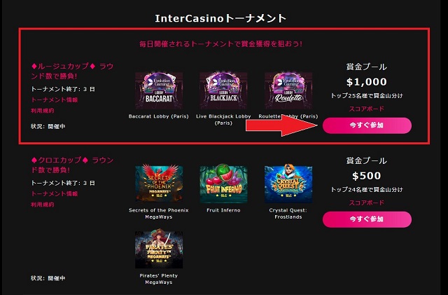 「今すぐ参加」をクリック後は、対象ゲームで遊ぶと自動的にトーナメントポイントが加算され、トーナメント終了時点で入賞していたプレイヤーにトーナメントボーナスが支払われます。
