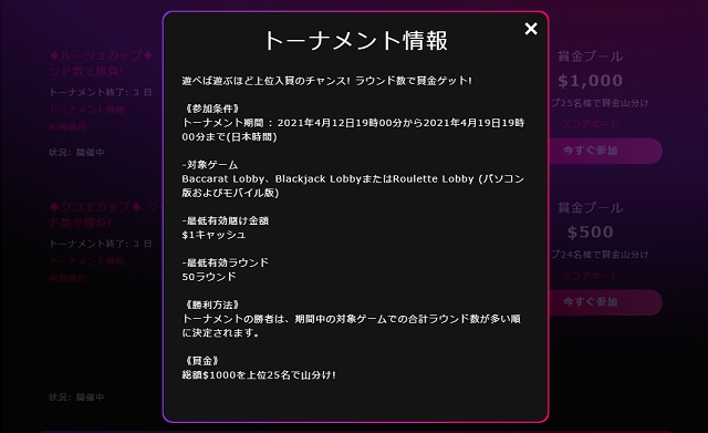 - 対象ゲーム…賭け金がトーナメントに反映されるゲーム