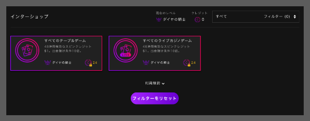 スピンクレジットは、インターカジノが指定したカジノゲームで使用できるボーナスです。レベル1【ダイヤの騎士】から購入できます。
