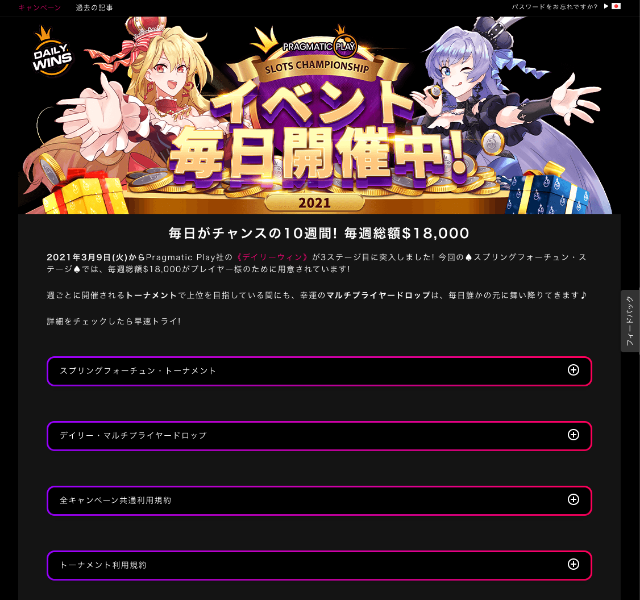 その他にも、デイリージャックポットやトーナメント、イベント・キャンペーンなど、キャッシュやフリースピンボーナスをもらえる機会はたくさんあります。