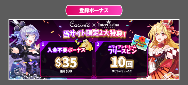 当サイト経由でインターカジノに登録すると、登録者全員に$35の入金不要ボーナス(登録ボーナス)と10回分のフリースピンが貰えます。