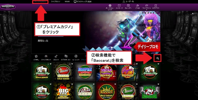 ジャックポットシティカジノのテーブルゲームでバカラを遊ぶには、上部メニュー欄から「プレミアムカジノ」をクリックしてください。