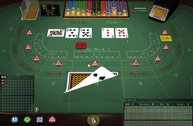 配当は、PLAYERに賭けて勝った場合が2倍。BANKERに賭けて勝った場合は1.95倍です。