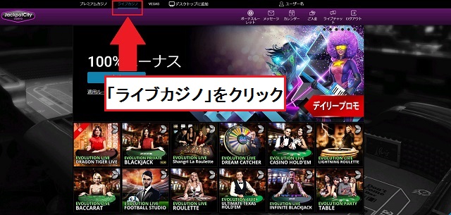 ジャックポットシティカジノのライブカジノでブラックジャックを遊ぶには、上部メニュー欄から「ライブカジノ」をクリックしてください。