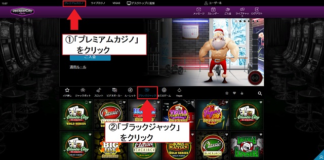 ジャックポットシティカジノのテーブルゲームでブラックジャックを遊ぶには、上部メニュー欄から「プレミアムカジノ」をクリックしてください。